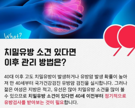 - 치밀 유방 여성은 40세부터 1~2년 간격으로 정기적인 유방 촬영을 받는 것이 중요합니다.