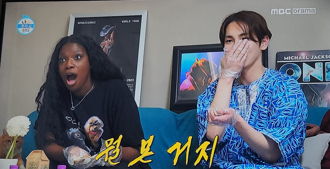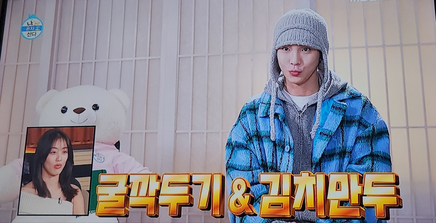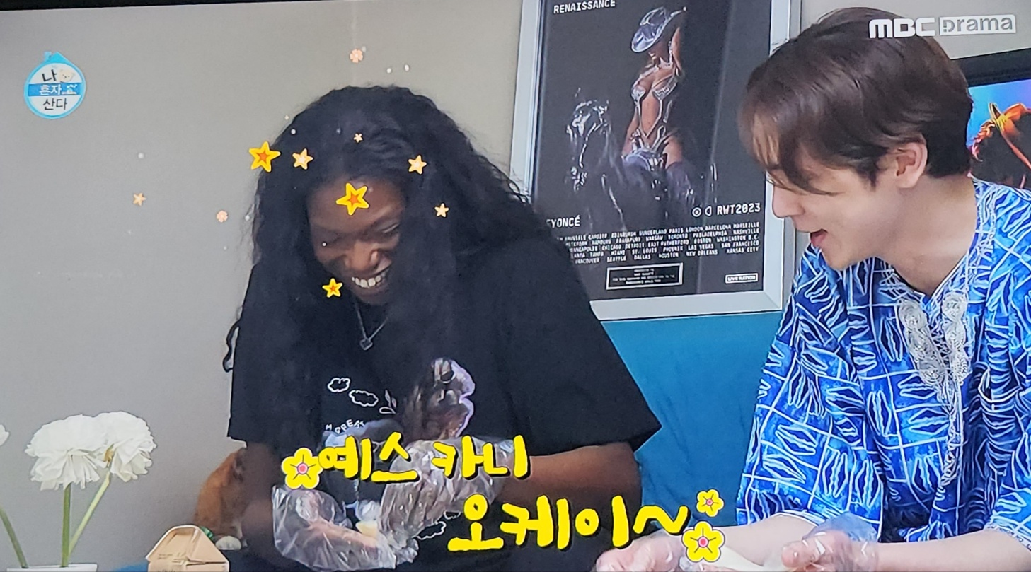 저희 집에도 없는 큰 찜통이랑 온갖 요리 재료들을 펼치며 시어머니가 좋아하는 굴깍두기와 김치만두 만들기를 시작했지요. 중간중간 어찌나 텐션을 끌어올리던지 흥 있는 극소수 외에는 다수의 보통 K며느리들과는 확실히 달랐어요. 신체적인 구조상 아빠다리를 하지 못하는 카니가 긴 다리로 불편했을 텐데도 초긍정 에너지로 셀프칭찬과 춤으로 그 시간을 견뎠네요.
