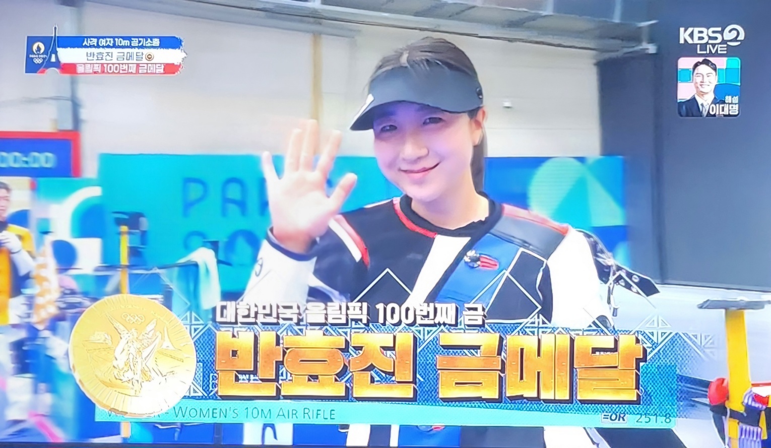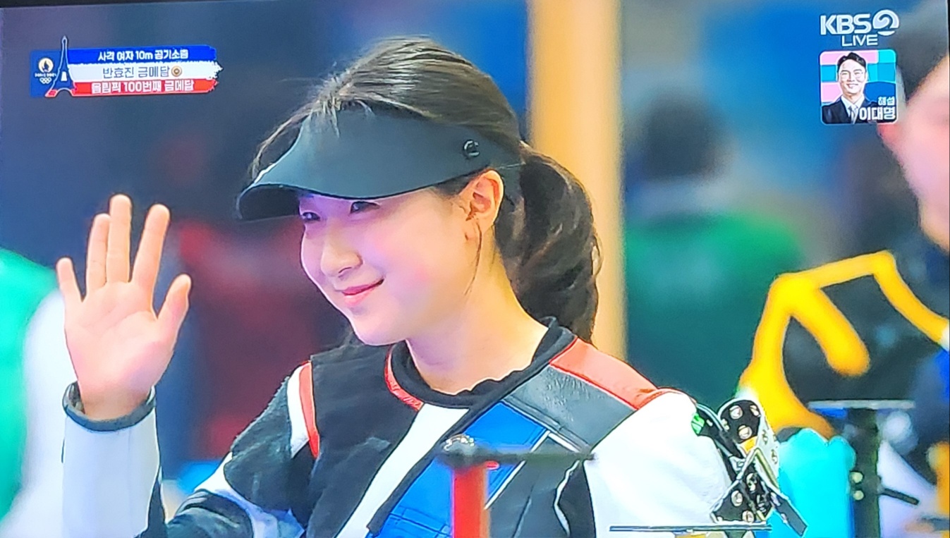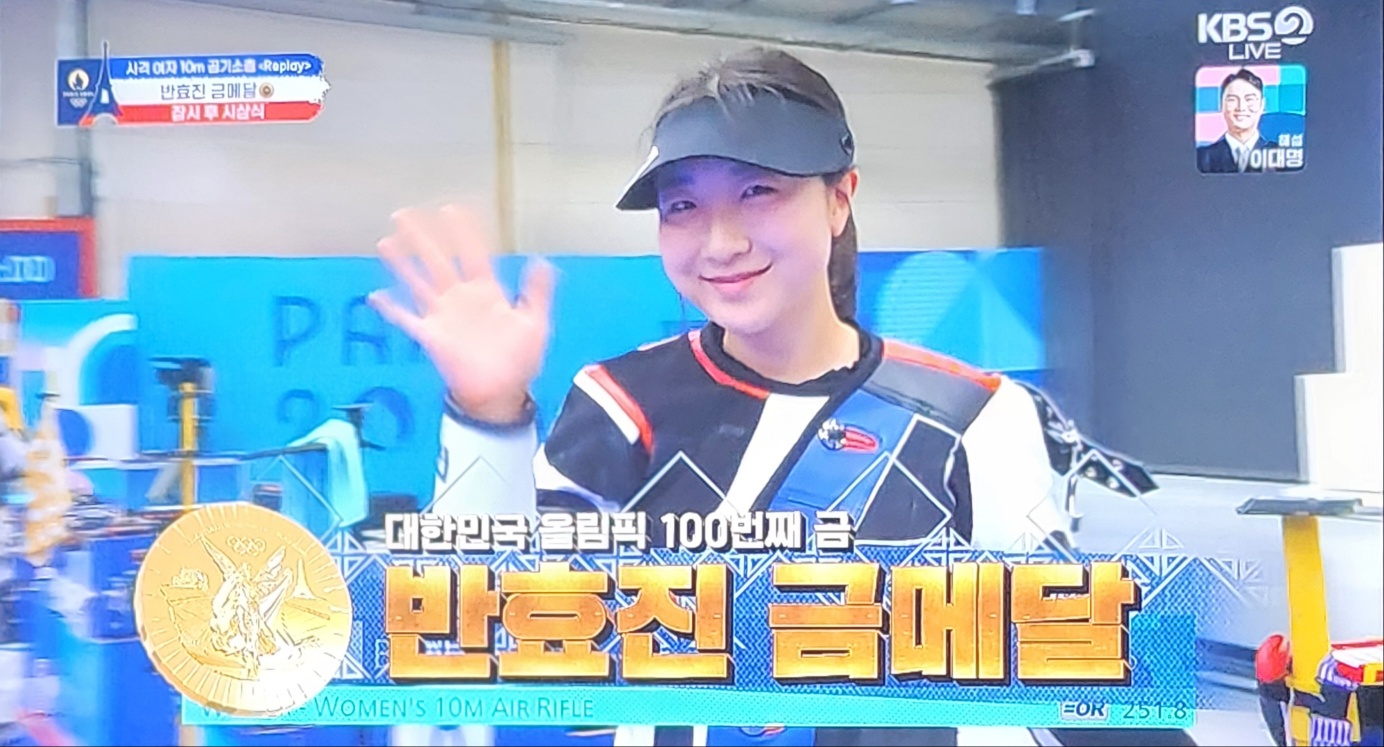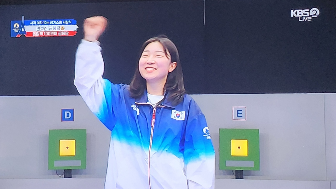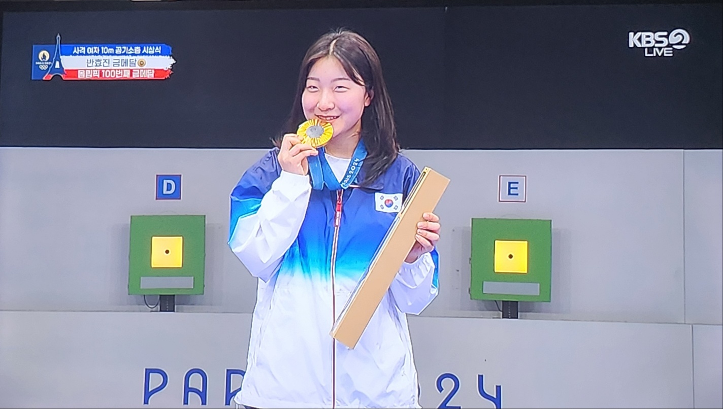 고등학생 선수가 대한민국 역사에 한 획을 긋게 되었습니다. 조금 전 끝난 사격 여자 10m 공기소총 결선 경기에서 반효진 선수가 금메달을 땄습니다. 이 금메달은 그냥 승리 금메달이 아닌 대한민국이 이제껏 올림픽에 나가서 딴 금메달 중에 100번째로 따낸 금메달입니다.