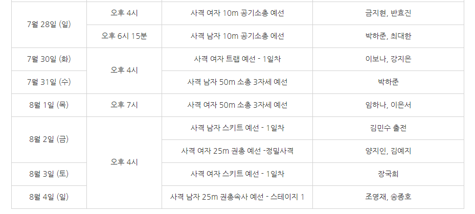 앞으로의 사격 일정은 다음과 같습니다. 7월 30일 화요일부터 참고해주세요. 대한민국 선수들 파이팅!!