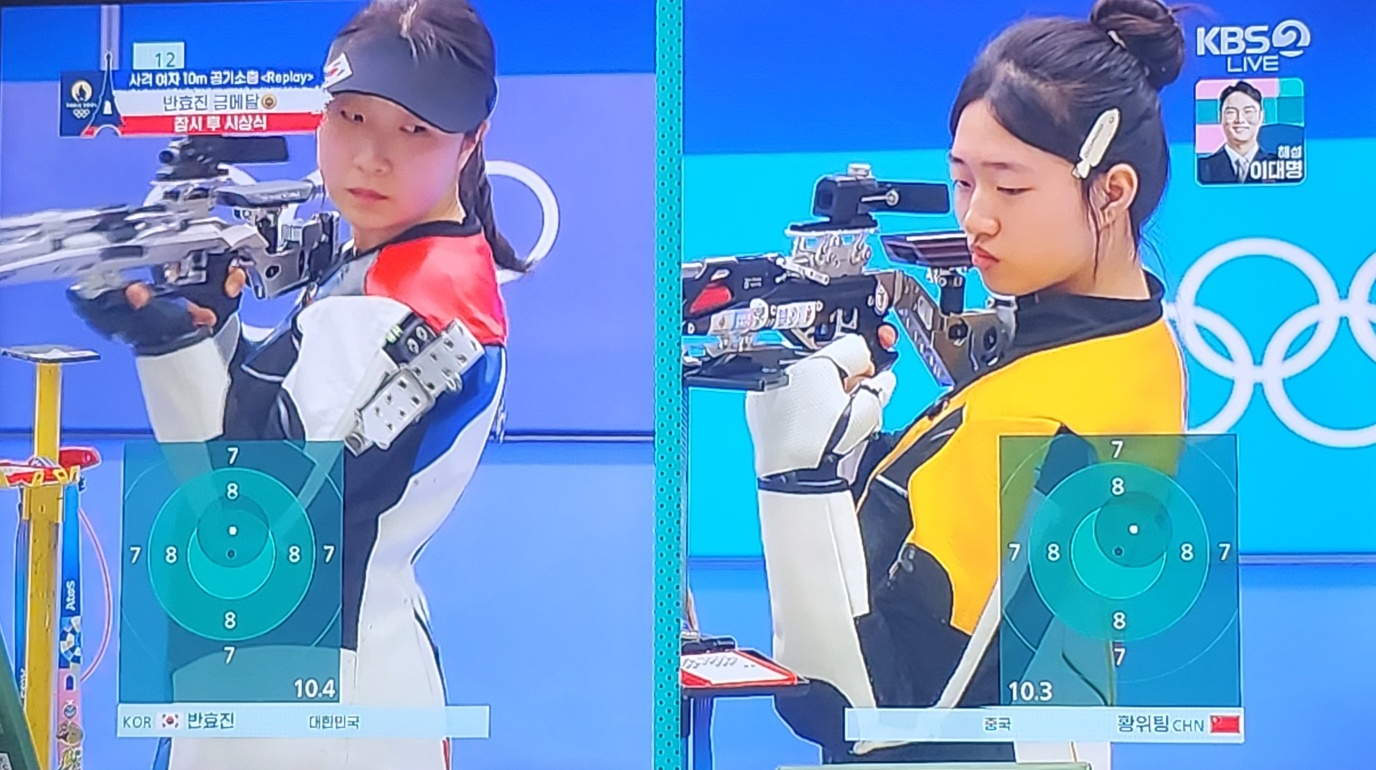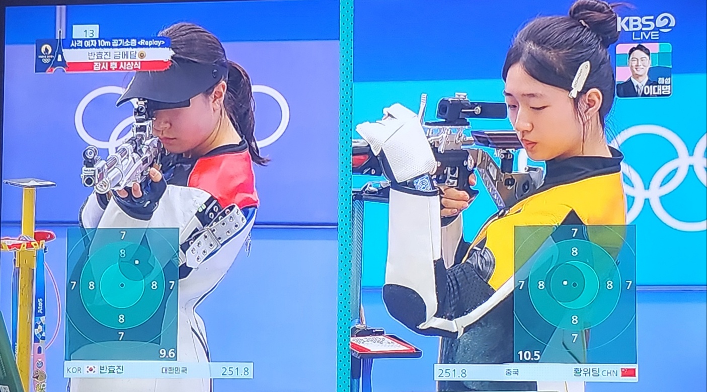 22발째 쉽게 끝날 줄 알았습니다. 왜냐면 긴장이 되었던지 황위팅선수가 9.6점을 쏘며 반효진 선수와 1.3점차가 났기 때문입니다. 바로 금메달 따는 줄 알았는데 우리 반효진 선수도 그 순간은 많이 떨렸나 봐요. 23번째 9.9점 24번째 9.6점으로 동점이 되고 슛오프까지 갔습니다.