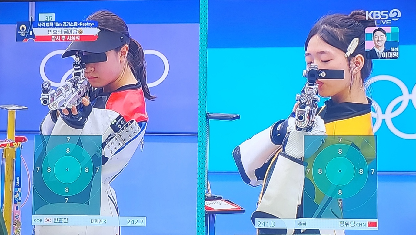 공기소총은 결선에 총 8명의 선수가 출전하며 10발을 쏘게 됩니다. 그 후 2발씩 쏘고 합계 점수가 가장 낮은 선수부터 탈락합니다. 반효진 선수는 공기소총 혼성에서 금메달을 딴 중국 황위팅 선수와 치열한 접전을 벌였는데요. 10점 대만 주로 쏘던 반효진선수가 8발에서 9점대를 쏴서 살짝 흔들리긴 했지만 금방 만회하더라고요.
