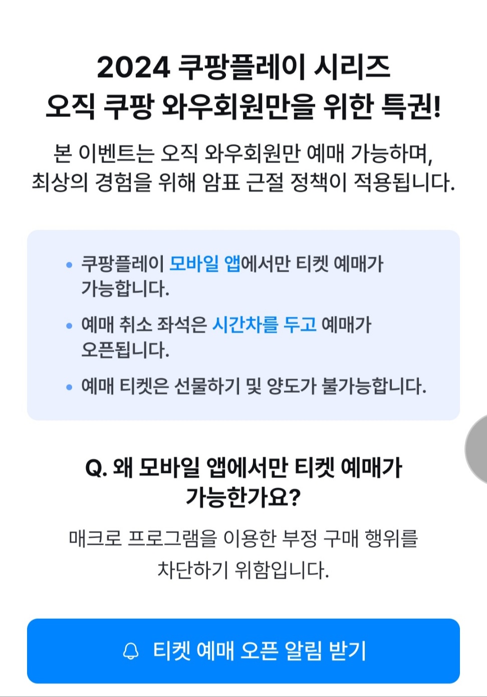 매크로 프로그램 부정 방지를 위해 오로지 쿠팡 모바일에서만 예매할 수 있습니다.