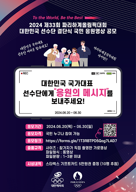 대~~ 한민국 👏👏👏👏👏 대~~ 한민국 👏👏👏👏👏 곧 우리 모두 하나 될 시간이 다가옵니다. 바로 파리올림픽인데요. 올해로 벌써 33회를 맞이했습니다. 나라를 대표해서 뛰는 선수들을 위해 마음을 모아볼까요?